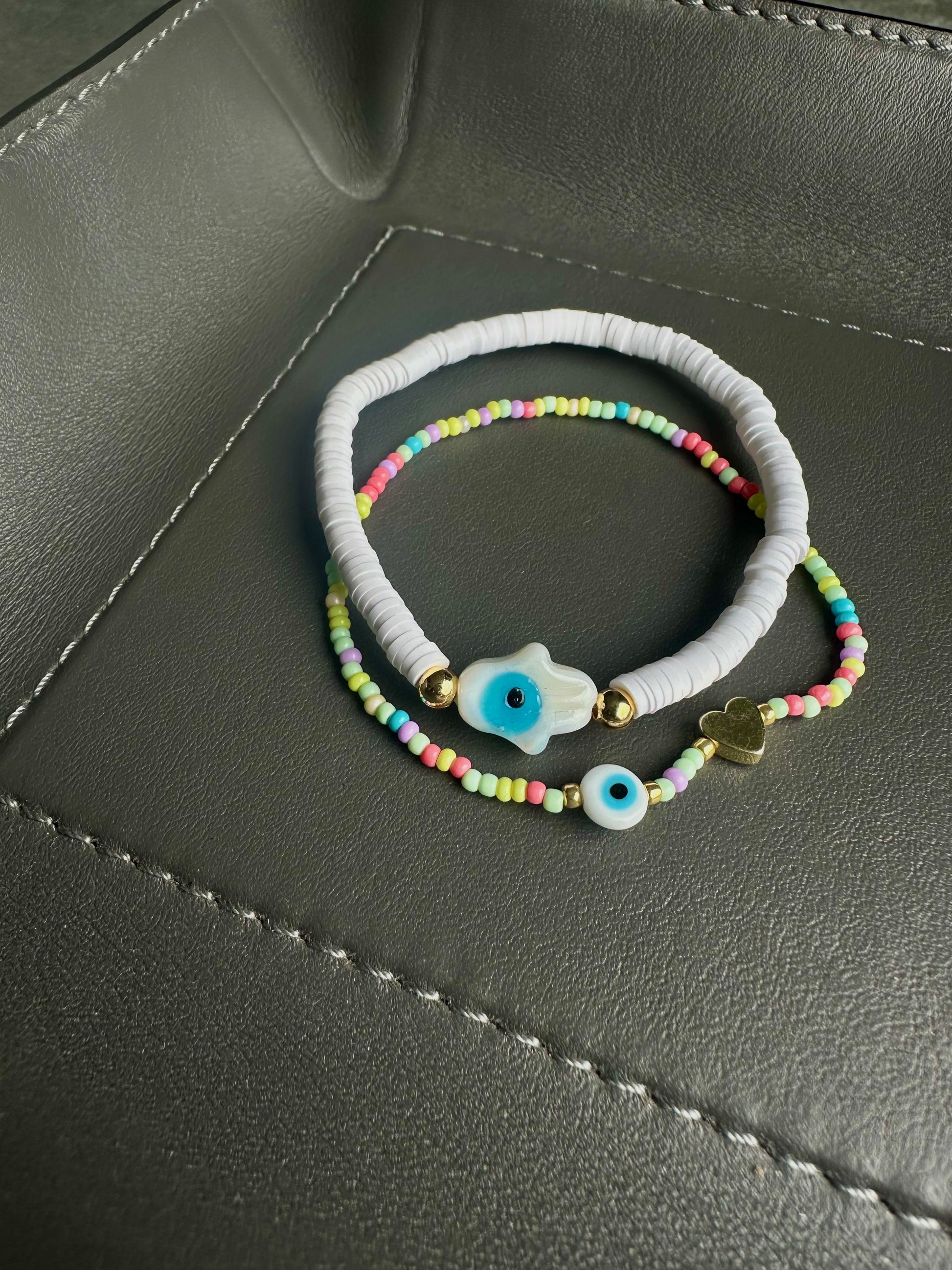 Die bunten Glasperlen werden durch ein goldenes Herz und ein Nazar-Amulett ergänzt – das „blaue Auge“ gilt traditionell als schützender Talisman gegen negative Energien. Das Armband ist elastisch, angenehm zu tragen und ein stilvoller Begleiter für jeden Tag – ob solo getragen oder im Layering-Look.